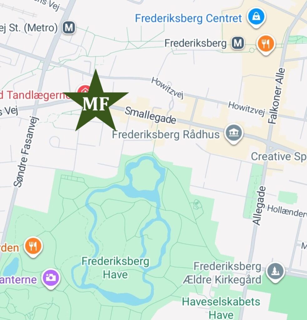 Parkering: Der er parkeringspladser (husk P-billet) ude foran klinikken og i gaderne omkring, samt et stort parkeringshus på John Winthers Plads (350 m fra klinikken), hvor man kan parkere til samme pris og under samme betingelser som på gaden. Læs evt. mere her: https://frederiksbergliv.dk/trafik/er-det-gratis-at-parkere-i-frederiksbergs-nye-p-kaelder-her-er-reglerne-du-skal-kende